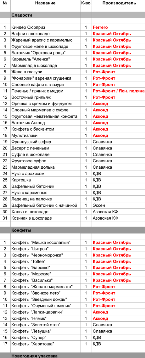Вафли в шоколаде (1 шт), Жареный арахис с карамелью (1 шт), Фруктовое желе в шоколаде (1 шт),Батончик "Ореховая роща" (1 шт), Карамель "Аленка" (1 шт), Мармелад в шоколаде (1 шт), Конфеты "Мишка косолапый" (1 шт), Конфеты "Цитрон" (1 шт), Конфеты "Черноморочка" (1 шт), Конфеты "Toffee" (1 шт), Конфеты "Барокко" (1 шт), Конфеты "Морские" (1 шт), Конфеты "Васильки" (1 шт)