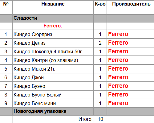 Киндер Сюрприз (1 шт), Киндер Делис (2 шт), Киндер Шоколад 4 плиток 50г. (1 шт), Киндер Макси 21 г. (3 шт), Киндер Кантри (со злаками) (2 шт), Киндер Джой (1 шт), Киндер Буэно (1 шт), Киндер Бонс (1 шт)