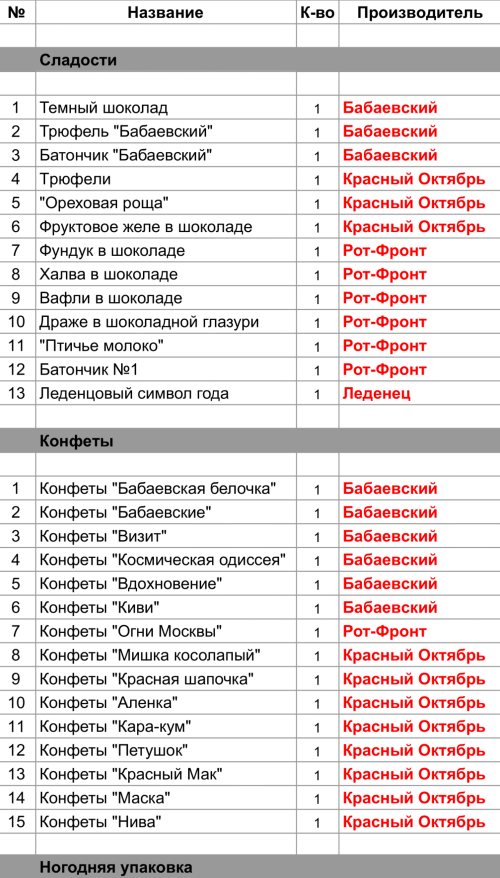 Трюфели (1 шт), "Ореховая роща" (1 шт), Фруктовое желе в шоколаде (1 шт), Конфеты "Мишка косолапый" (1 шт), Конфеты "Красная шапочка" (1 шт), Конфеты "Аленка" (1 шт), Конфеты "Кара-кум" (1 шт), Конфеты "Петушок" (1 шт), Конфеты "Красный Мак" (1 шт), Конфеты "Маска" (1 шт), Конфеты "Нива" (1 шт)